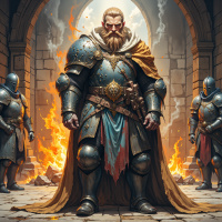The image depicts a medieval scene with a central character who appears to be a warrior or knight. This character has a beard and mustache, is wearing a helmet with red plumes, and is adorned in heavy armor with intricate patterns on the breastplate. He holds a longsword in his right hand, which is sheathed and attached to a belt. The knight's cloak is blue with gold accents and hangs over his shoulders. Behind the central figure, there are other individuals dressed similarly but without helmets, indicating they might be soldiers or servants. They are wearing armor, though it seems lighter in comparison to the central character's gear. The background features a ruined archway with fire consuming the wooden elements, suggesting destruction or battle. The overall style of the image is illustrative and appears to be inspired by fantasy art commonly used in video games or novels set in medieval times.