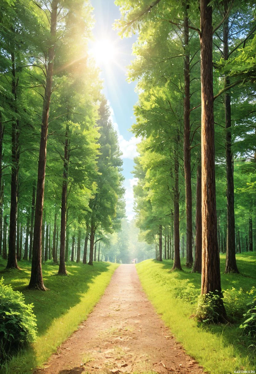 a serene scene set in a forest. There is a well-trodden path leading towards the viewer, flanked by