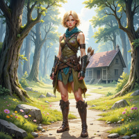 На картинке в центре стоит женщина, одетая в зелёный и коричневый наряд, как у персонажа из фэнтези. На ней кожаная нагрудник, а на спине колчан со стрелой, готовой к бою. Её поза говорит о настороженности и готовности ко всему, что впереди. Место действия, похоже, деревенская местность: она стоит на прогалине, окружённой деревьями и лугом. Тропинка проходит через этот пейзаж, уводя вглубь, где среди зелени приютилась уютная деревянная избушка. Общая атмосфера пронизана спокойствием и предвкушением приключений.