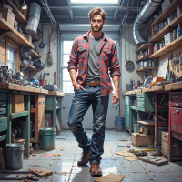 На картинке запечатлен молодой человек, стоящий в помещении, похожего на промышленную мастерскую или гараж, где полно разнообразных инструментов и оборудования для механики и авто. На нём повседневная одежда: клетчатая рубашка, джинсы, ботинки и ремень. Его поза выражает уверенность, когда он позирует для фотографии. На заднем плане – беспорядок из верстаков, ящиков с инструментами, механических деталей и инструментов, что указывает на мастерскую по ремонту или строительству.