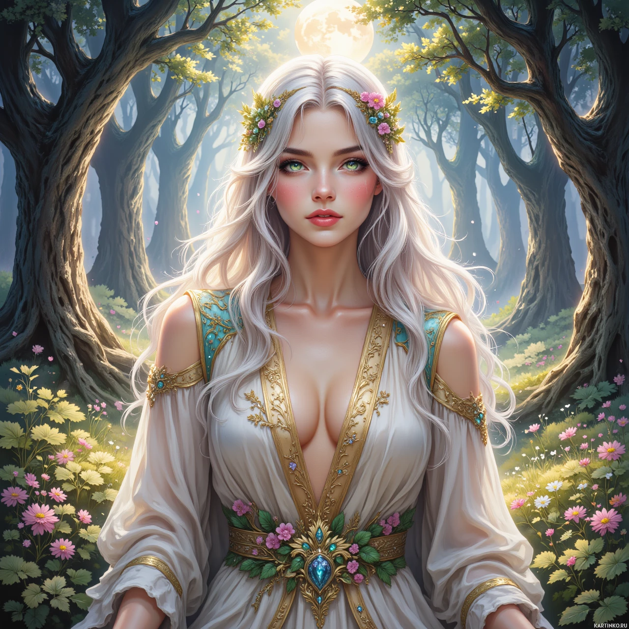 На картинке изображена женщина с белыми волосами в золотом платье, что указывает на фантазийную или мифическую тематику. У неё деликатный макияж, подчеркивающий её неземную красоту, и выразительные голубые глаза. На шее – изящный цветочный венок. Выражение лица – задумчивое или созерцательное. Она стоит в том, что похоже на заколдованный лес. Солнечный свет пробивается сквозь листву, отбрасывая пятнистые тени и выделяя сочную зелень вокруг. Землю усыпаны полевыми цветами разных цветов, добавляющими нотку сказочности. Стиль картинки, включая цветовую гамму и освещение, придает ей нереальный, сказочный характер.