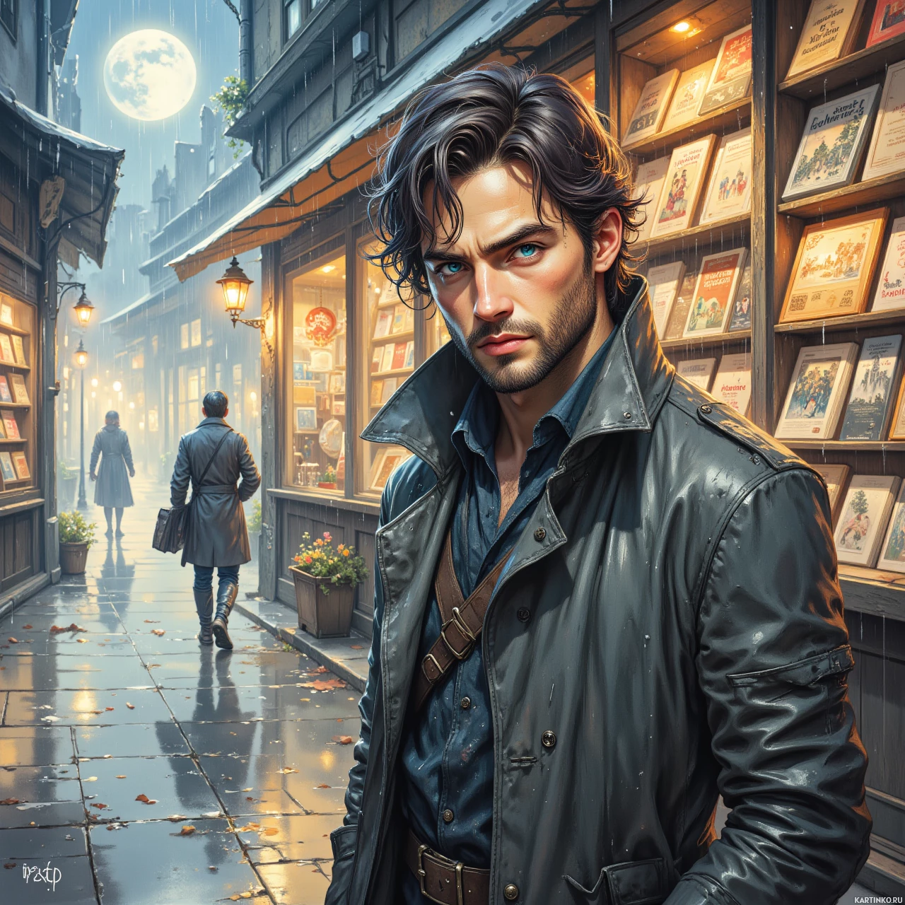 На картинке мужчина стоит в ночном переулке под дождем. У него темные волосы до плеч и темное пальто с шарфом, что говорит о холодной погоде. Выражение лица серьезное или задумчивое. На заднем плане видны подсвеченные витрины и вывески, создающие атмосферу старого мира, возможно, напоминающую сцену из викторианской истории или современного нуарного детектива. Земля мокрая от дождя, отражая свет фонарей и фасадов зданий. Общее настроение картинки – мрачное и атмосферное.