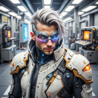 В центре картинки уверенно стоит мужчина. На нём футуристический доспех преимущественно белого и серого цвета с оранжевыми акцентами, добавляющими яркости. Шлем, повторяющий стиль его костюма, скрывает взгляд за визором. Доспех выглядит как металлический, что подчеркивает его прочность и передовые технологии. Мужчина расположен в, судя по всему, футуристическом окружении. Позади него – разнообразное оборудование, намекающее на технологические достижения этого места. Слева видны терминалы или панели управления, а справа – большой экран с запутанной графикой. Вся общая атмосфера пронизана ожиданием и готовностью, будто мужчина готовится к важной миссии или операции. Расположение объектов сбалансировано, чтобы привлечь внимание к центральной фигуре и одновременно дать представление о его роли в этом окружении.