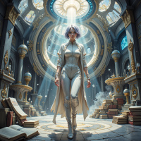 В центре картинки стоит женщина в белых доспехах с плащом, стоящая на каменной платформе, будто парящей в воздухе. Её окружает богато украшенный зал, полный замысловатых деталей и различных предметов: книг, глобусов, бра. Архитектура выдержана в готическом стиле, с остроконечными арками и витражными окнами. Выражение лица женщины серьёзное, словно отражающее чувство ответственности или долга.