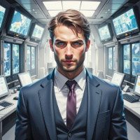 The image depicts a man standing in what appears to be an advanced control room with multiple screens and panels displaying various charts, graphs, and information related to climate or environmental data. The man is dressed in a suit with a tie, suggesting a formal or professional setting. His expression is serious, and he is looking directly at the camera, which gives him a focused and determined appearance. The lighting in the room has a cool tone, emphasizing the technical atmosphere of the environment.