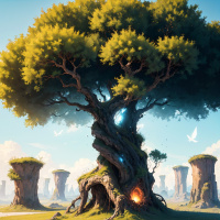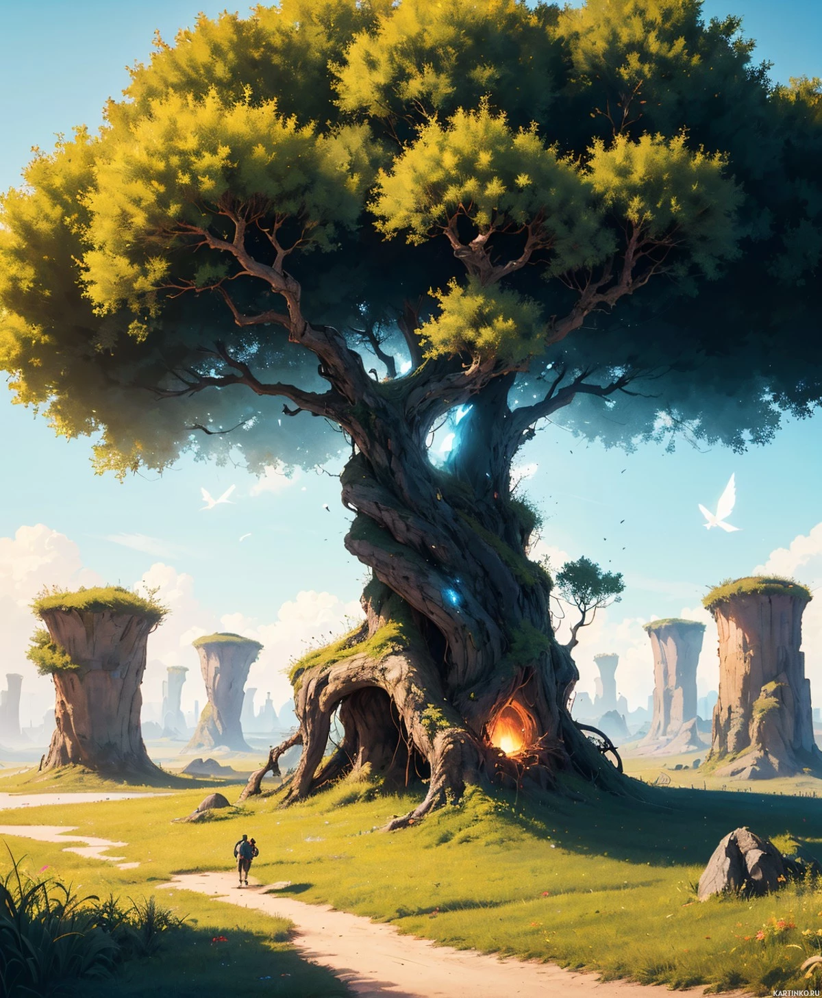 white bird flying. There is also a figure standing on the left side of the image, facing away from the viewer and looking towards the tree. The overall setting suggests a peaceful, natural environment within a fantasy realm.