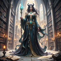 На картинке изображена героиня, очевидно, из фэнтезийного мира. В центре – девушка с длинными, струящимися волосами и заостренными ушами, что может говорить о её эльфийской или демонической природе. У неё тёмная кожа и она одета в сложный наряд, украшенный замысловатыми узорами, драгоценностями и плащом. В правой руке она держит посох или скипетр с голубым камнем наверху. Её лицо выражает серьезность и напряжение, взгляд направлен прямо вперёд. Фоном служит интерьер, напоминающий библиотеку или кабинет из средневековья: каменные арки, книжные полки, полные книг, и свет свечей, создающий тёплую атмосферу. Освещение на картинке драматичное, акцентирующее внимание на героине и создающее атмосферу таинственности.