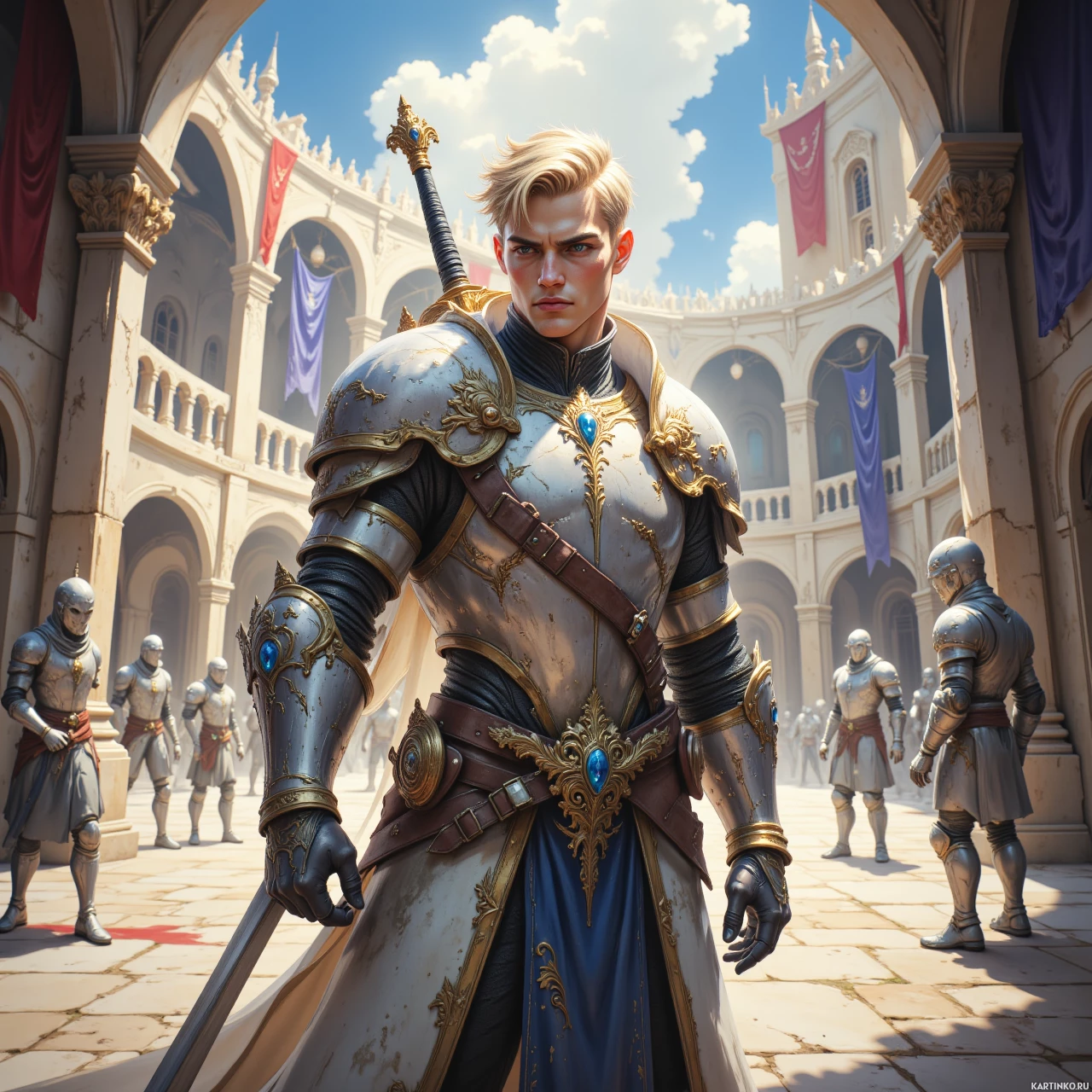 На картинке запечатлён персонаж в доспехах и оружии в средневековом стиле. У него светлые волосы, на голове – шлем, полностью закрывающий голову, украшенный перьями. Доспехи имеют золотые или металлические вставки на нагруднике и плечах. Вокруг груди видны ремни и пряжки, придающие конструкции как функциональность, так и статус. Персонаж держит меч в одной руке и имеет щит, закреплённый на левом запястье. На заднем плане виден арочный проход, возможно, мост или ворота, выполненный в средневековом архитектурном стиле, с высокими колоннами и развевающимися флагами. На заднем плане видны другие персонажи, одетые в похожие доспехи, что позволяет предположить, что они тоже солдаты или воины. Общее впечатление – это сцена исторической фэнтези или, возможно, кадр из видеоигры, действие которой разворачивается в средневековом или фэнтезийном мире.