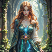 A young woman with red hair, wearing a medieval-style dress and ornate headpiece that features a blue stone at the center of her forehead. The dress has laces and intricate embroidery details. She is standing amidst vines and trees in an otherworldly forest setting.