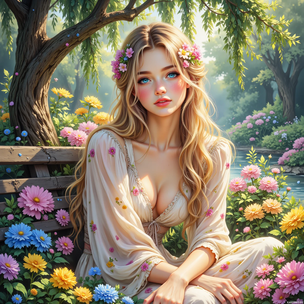 На картинке изображена молодая женщина с длинными светлыми волосами и голубыми глазами. У неё светлая кожа, а на лице лёгкий макияж, подчеркивающий черты лица. Она одета в струящееся платье с открытыми плечами, украшенное цветочным узором в нежных оттенках жёлтого и белого. Её волосы ниспадают на плечи, а вокруг неё – яркие цветы самых разных цветов: фиолетовые, розовые, жёлтые и белые. Кажется, что действие происходит в тихом саду или на лугу, среди пышной зелени, деревьев и водоёма, возможно, ручья или реки, который виден сквозь листву.