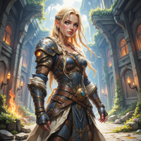 На картинке изображена девушка с светлыми волосами в доспехоподобном наряде, стоящая в том, что похоже на подземное помещение. На ней металлический нагрудник со сложной гравировкой, а на голове – шлем, украшенный перьями. Выражение лица нейтральное, и она смотрит прямо на зрителя. На заднем плане стены с текстурой, напоминающей камень, и арки, намекающие на рукотворную конструкцию, например, подземелье или пещеру. Освещение создает драматические тени, добавляя глубину сцене.