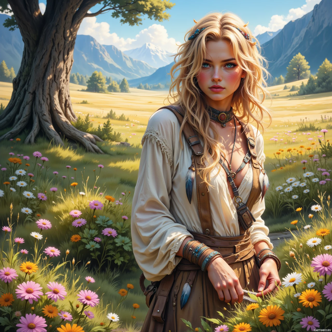 На картинке запечатлена молодая женщина в фантастическом сеттинге. У неё длинные светлые волосы, а выражение лица серьезное, она смотрит в сторону. Её наряд кажется вдохновленным исторической или фантазийной одеждой, с элементами кожи и украшениями. На заднем плане виднется пышное зеленое поле с цветами, среди которых особенно выделяются желтые полевые цветы на переднем плане.