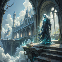 The image depicts a fantastical scene featuring a wizard on a stone bridge overlooking a grand castle in the background. The wizard is dressed in long robes with hooded cloaks, suggesting an air of mystery or otherworldliness. They are standing with their arms outstretched, and what appears to be magical energy crackles around them, indicating some form of arcane power. There are cloud-like structures above the castle, contributing to the ethereal quality of the setting. The overall style of the image is reminiscent of high fantasy artwork, evoking a sense of majesty and enchantment.