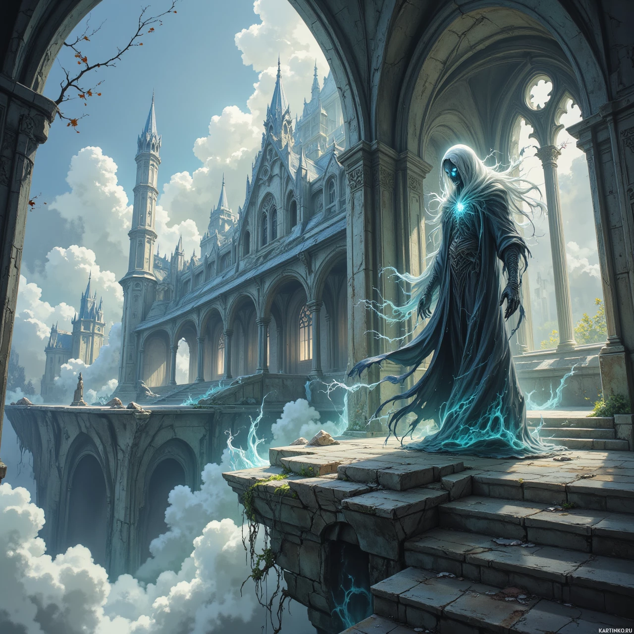 Картинка изображает фантастическую сцену: волшебник стоит на каменном мосту, откуда открывается вид на величественный замок вдали. На нём длинные одежды с капюшоном, что придает образу загадочность и неземную атмосферу. Его руки раскинуты в стороны, а вокруг него потрескивает, кажется, магическая энергия, свидетельствующая о владении тайными силами. Над замком парят облакообразные структуры, усиливающие нереальность пейзажа. Стиль картинки напоминает высокофантазийные иллюстрации, вызывая ощущение величия и очарования.
