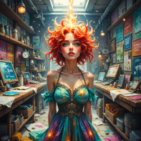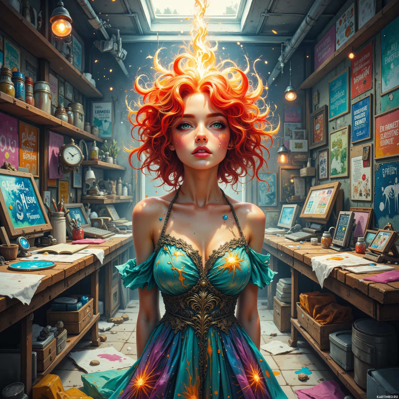 На картинке изображена девушка с рыжими волосами, собранными в пучок, в платье, сочетающем зеленый, желтый и синий цвета. Она держит над головой бенгальский огонь или подобный предмет, светящийся на кончике. Ее лицо выражает нейтральное выражение, и она смотрит прямо на зрителя. На заднем плане — интерьер с картинами на стенах и частично скрытыми плакатами или вывесками. Видна полка с книгами разных размеров и цветов, а также письменный стол, заваленный, кажется, бумагами или работами. Общая атмосфера создает ощущение творческой мастерской.