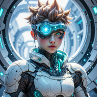 На картинке изображен человек в футуристических доспехах в стиле научной фантастики. Судя по чертам лица и прическе, это молодой человек, вероятно, девушка. Доспехи преимущественно белые с синими и металлическими акцентами, что подчеркивает их высокотехнологичный дизайн, характерный для научно-фантастических миров. Одной из особенностей является необычная прическа, напоминающая молнию или растрепанные шипы, усиливающая футуристический образ. В доспехах присутствует шлем-подобное устройство, закрывающее глаза и уши, вероятно, служащее для связи или защиты. Фоном служит стилизованное изображение механизмов или сложной машинной конструкции, гармонирующее с общей научно-фантастической тематикой. Освещение создает драматический эффект вокруг головы и плеч персонажа, выделяя его характер и сложные детали доспехов.