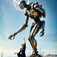 a clear sky above. The robot's design suggests