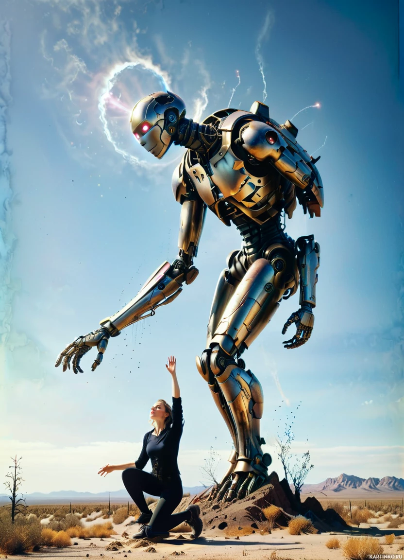 a science fiction scene with a girl and a robot. The girl, appearing to be in awe or admiration, is kneeling on the ground in front of a towering metal