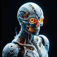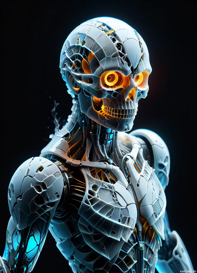 The image features a robot with a skull-like appearance. It has intricate mechanical details, and there are visible orange glowing eyes that give it