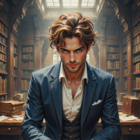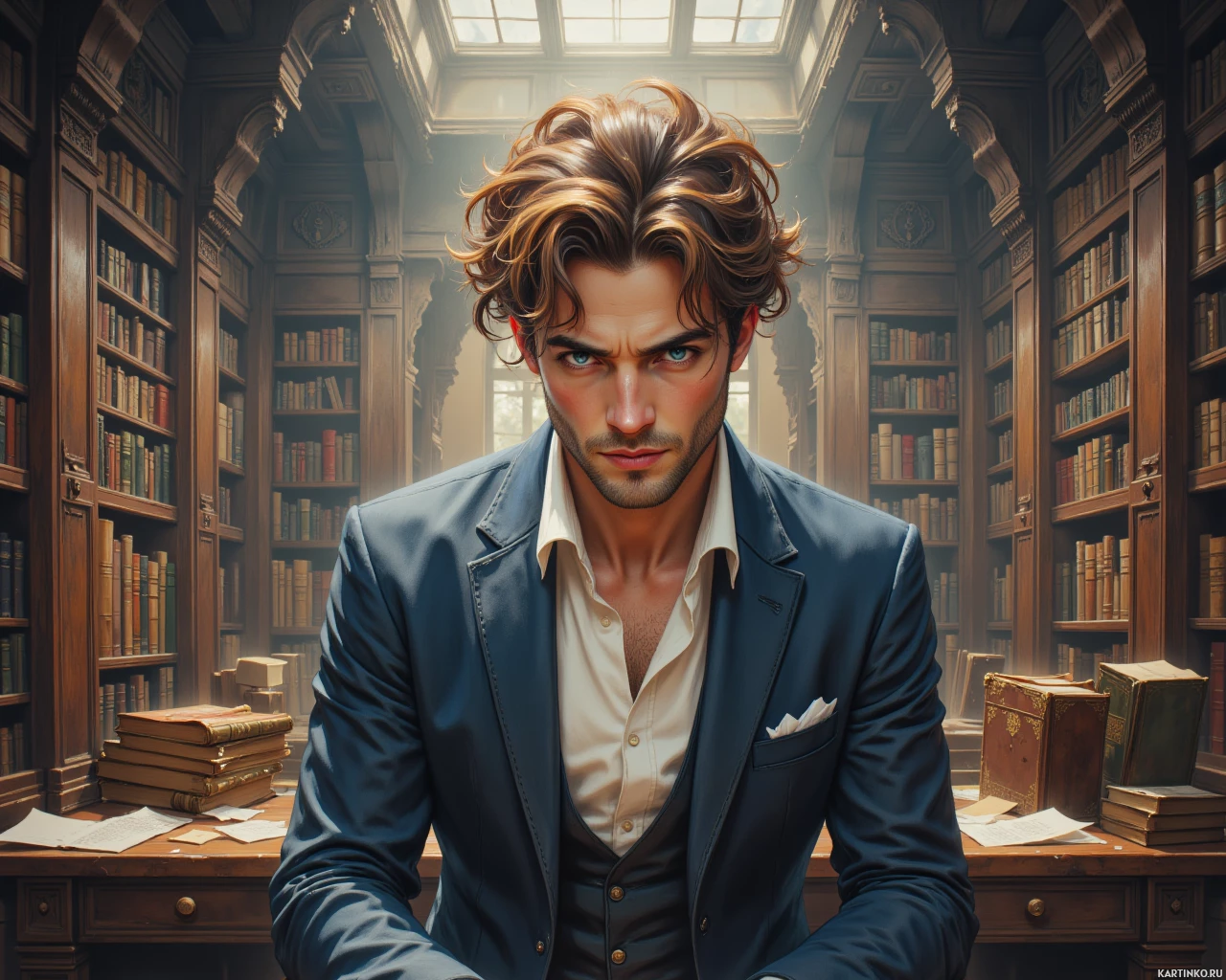 На картинке мужчина сидит за столом, вероятно, в кабинете или библиотеке. Позади него – полки, уставленные книгами. На нем костюм, темные волнистые волосы падают на лоб. Выражение лица серьезное, он смотрит прямо на зрителя. Освещение приглушенное и сосредоточено на человеке, создавая драматичную атмосферу.