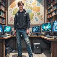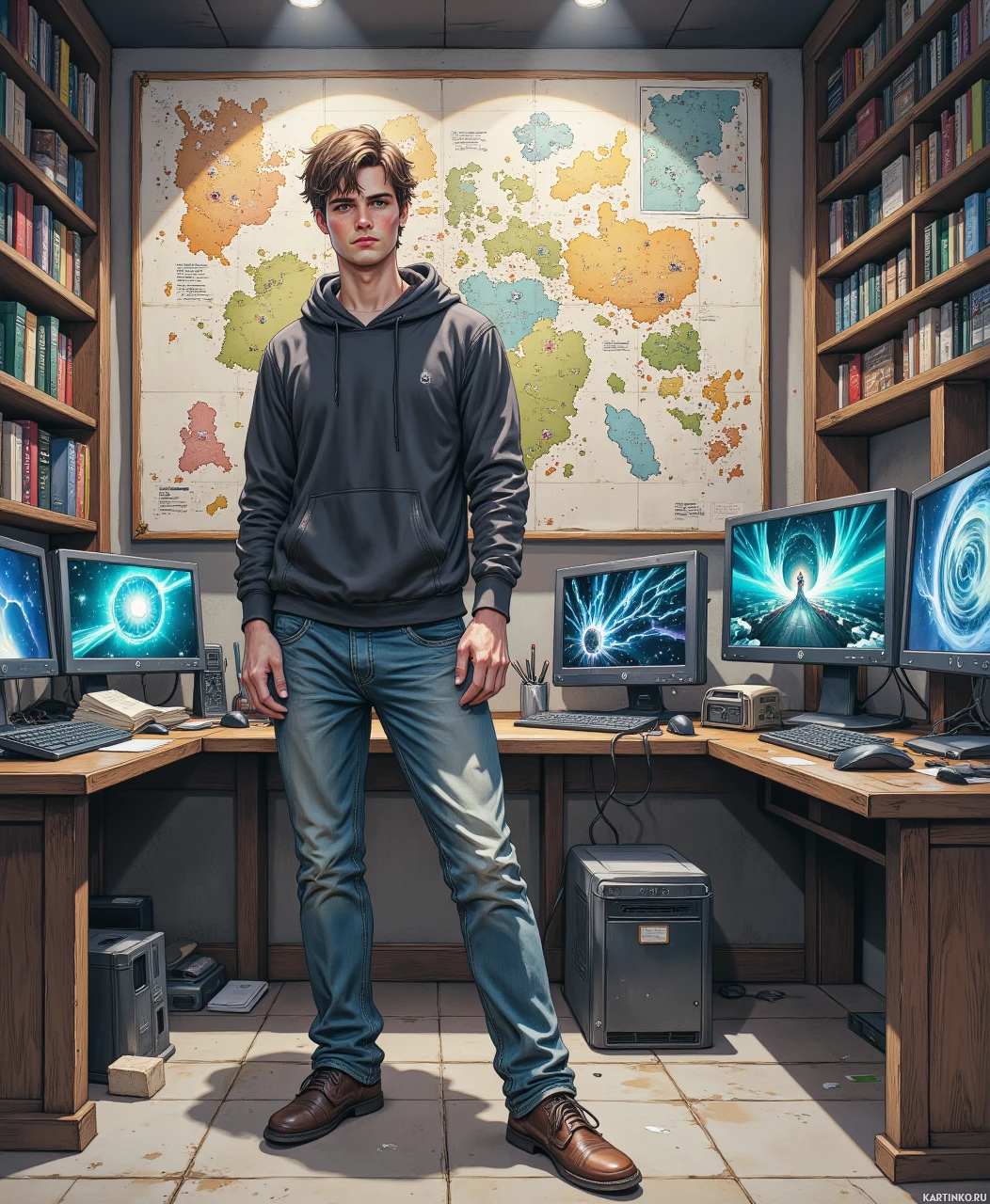 На картинке изображен молодой человек, стоящий в комнате, напоминающей личный кабинет или кабинет для работы. На нем черная толстовка и синие джинсы, руки скрещены на груди. За его спиной два компьютерных монитора показывают графику, похожую на видеоигру. Справа висит большая карта со схематично выделенными регионами. По обеим сторонам комнаты расположены деревянные полки, заставленные книгами, что говорит о том, что это может быть домашний офис или персональная библиотека. Освещение в комнате искусственное, создающее теплую атмосферу.