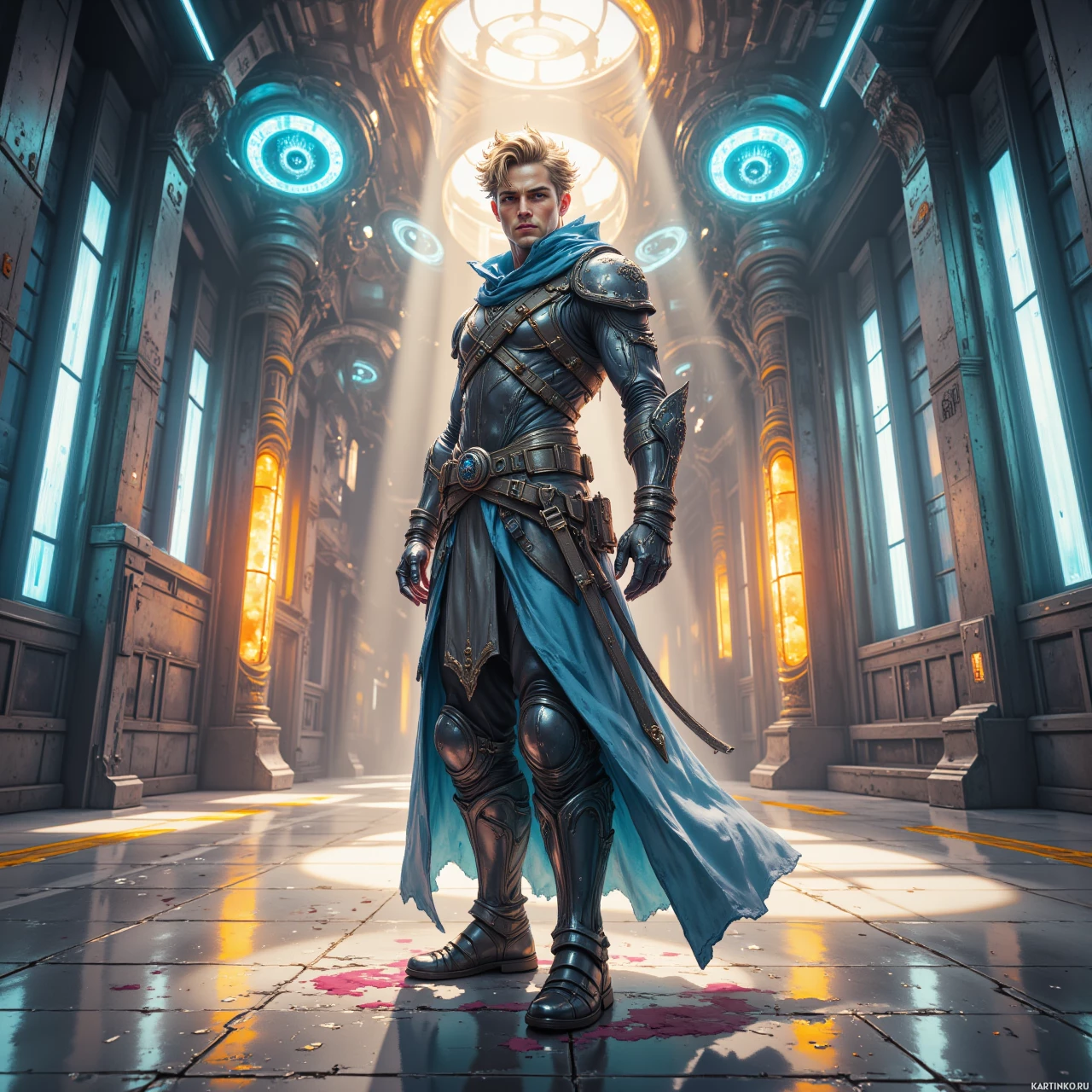 На картинке стоит воин в камере, пронизанной потусторонней атмосферой. На нём доспехи синего и серого цвета, едва мерцающие – кажется, они не из металла, а сделаны из лёгкого керамического материала или композита, ориентированного на функциональность, а не на традиционную эстетику. Плащ ниспадает на плечи, добавляя загадочности. Воин держит два меча, скрещенных перед собой в форме "X" – часто встречающийся символ в фэнтезийных мирах. Клинки слегка изогнуты и выглядят острыми, что говорит об их готовности к бою. На заднем плане сложная структура с парящими голубыми сферами, освещающими пространство под сводами. Каменные стены окружают воина, украшенные замысловатыми резными узорами, намекающими на место, исполненное важности или власти. Пол вымощен серым камнем, что придает обстановке ощущение суровости и индустриальности. Общая атмосфера наполнена ожиданием и готовностью, словно воин готовится к неминуемому конфликту.