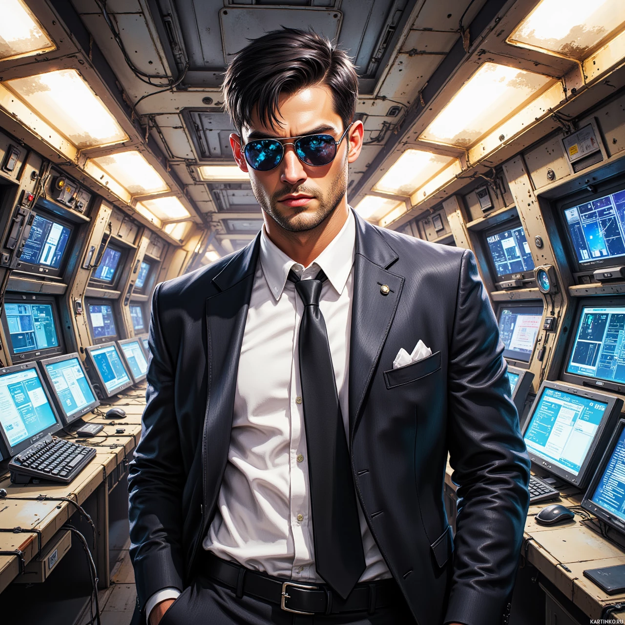 На картинке мужчина стоит в помещении, напоминающем рубку управления или кабину. На нём тёмный костюм, белая рубашка и галстук, солнцезащитные очки, короткая стрижка. Вокруг – множество компьютерных мониторов с различными экранами, отображающими технические данные и графики. Окружающее пространство намекает на авиационную или космическую тематику, учитывая дизайн помещения и присутствующее оборудование.