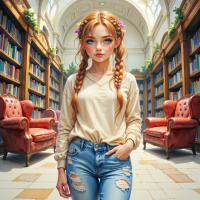 The image portrays a young woman with long blonde hair, styled in two braids that fall over her shoulders. She has a fair complexion and is looking off to the side with a neutral expression on her face. Her eyes are light-colored, and she appears to be wearing makeup that includes lipstick and mascara. She is dressed in a casual manner, wearing a light green sweater over a white long-sleeve top. The sweater has a round neckline and no visible collar. She pairs the sweater with blue jeans that are ripped at the knees, revealing skin tone underneath. The background suggests an indoor setting with wooden bookshelves filled with books and decorative objects such as vases and plants on the shelves. The lighting in the scene is soft, with no harsh shadows visible, which gives the image a warm and inviting ambiance.