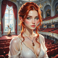 На картинке изображена девушка с ярко-рыжими волосами, уложенными в сложную прическу с замысловатыми косами. У неё светлая кожа и выразительные голубые глаза, подчеркнутые подводкой и тенями, которые акцентируют взгляд. Выражение лица спокойное и задумчивое, с легкой складкой на губах. На ней наряд, вдохновленный историческим или фэнтезийным стилем, включая платье с открытым плечом, украшенное белым кружевом. Вокруг шеи – темное ожерелье, а кожа у неё очень светлая. За ней – роскошная комната, оформленная в помпезном стиле барокко, с красными бархатными драпировками и золотой мебелью. На стенах – люстры и картины, а на заднем плане виден рояль, что создает впечатление королевской обстановки или места для элитных выступлений.