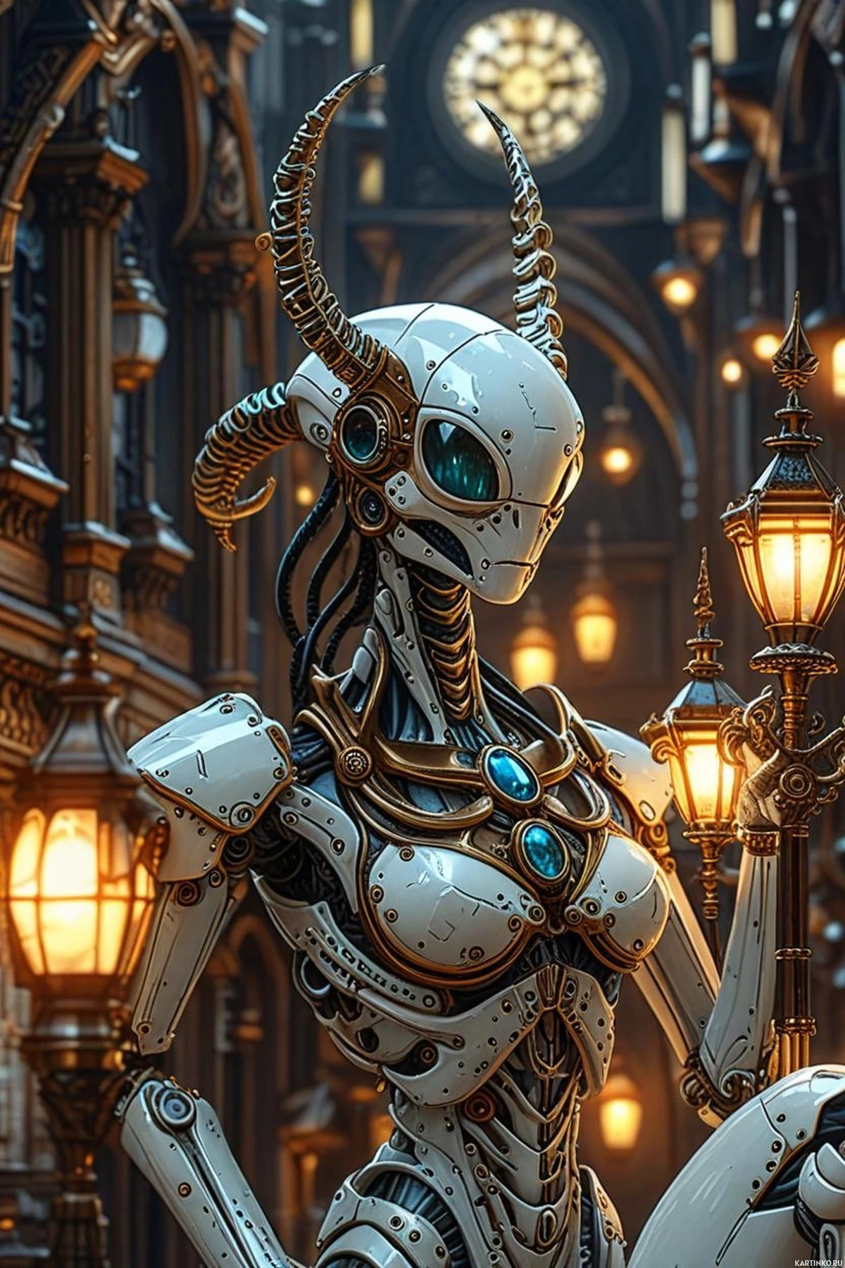 an interior space with Gothic architectural elements, including arches and decorative fixtures that resemble candelabra or lanterns. The robot's expression suggests a thoughtful or contemplative demeanor.