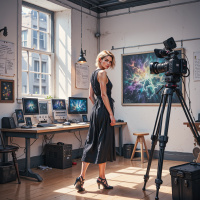 На картинке изображена женщина с светлыми волосами. На ней черное платье, она стоит спиной к камере. На заднем плане несколько компьютерных мониторов, на которых отображаются научные или технологические данные. Виден фотоаппарат, установленный на штативе, что указывает на то, что это может быть студия, связанная с медиапроизводством или вещанием. Освещение в помещении говорит о том, что это может быть комната с естественным светом, поступающим из-за невидимых в кадре окон.