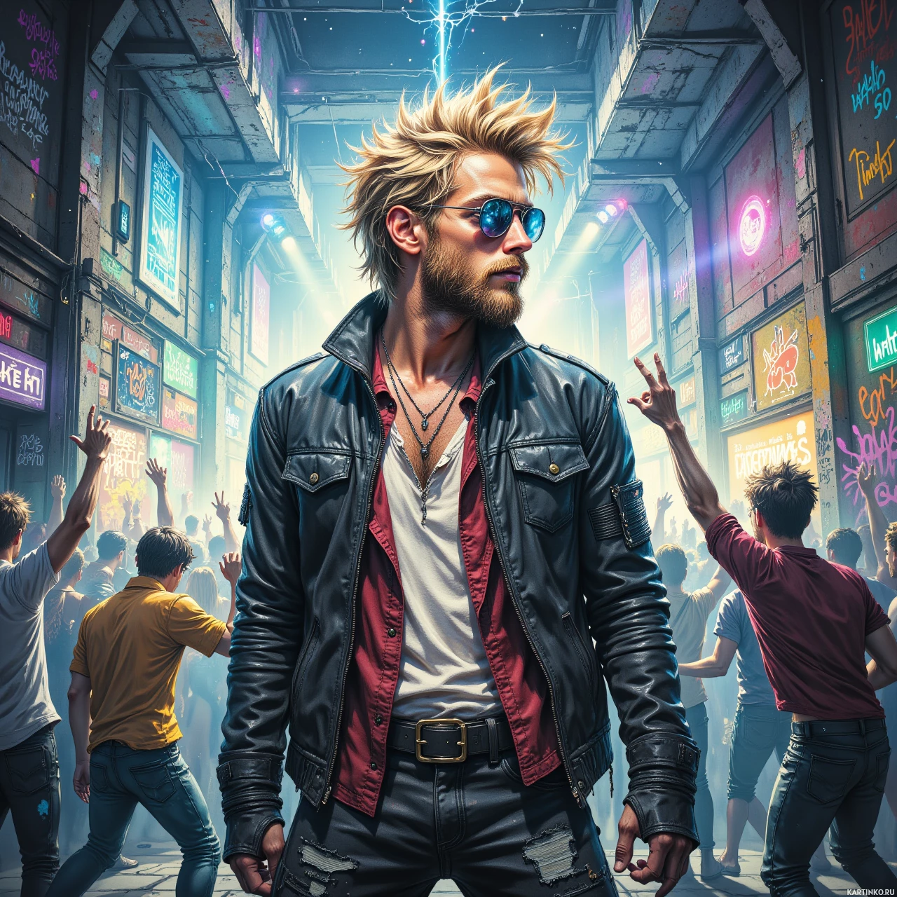 На картинке трое мужчин в яркой, футуристической обстановке, напоминающей закулисье концертного зала, с рекламой и неоновыми огнями. Мужчина на переднем плане в солнцезащитных очках и с ирокезом, одет в черную кожаную куртку и уверенно стоит, глядя направо, будто позирует для фото. За ним – еще двое мужчин: один, кажется, танцует, а другой показывает, что похоже на знак мира. Все трое заняты своими делами в этой динамичной сцене.