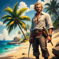 На картинке мужчина стоит на песчаном пляже, на заднем плане пальмы и океан. У него борода и мускулистое телосложение, он одет в одежду в стиле определенной эпохи: бриджи, сапоги, рубашку с закатанными рукавами, пояс с пряжкой, и держит меч.