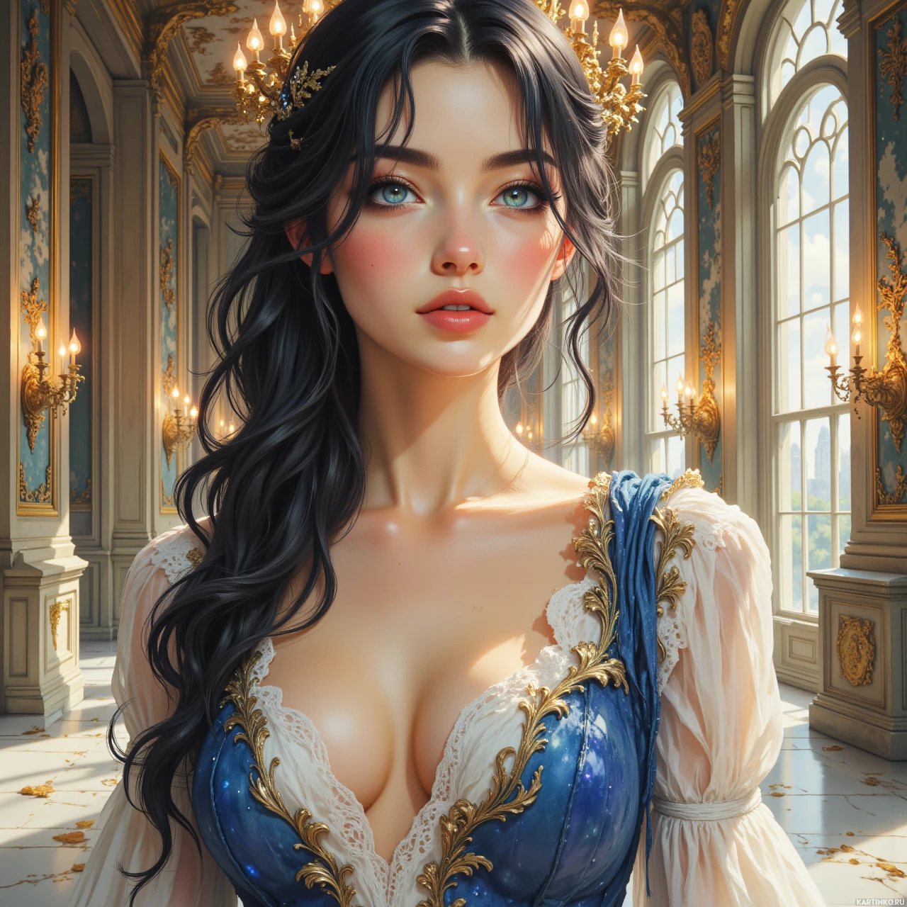На картинке изображена девушка с каштановыми волосами, уложенными в небрежные локоны, спадающие на плечи. У неё светло-голубые глаза и лёгкий румянец на щеках, придающий ей нежный вид. На ней голубой корсет с замысловатыми кружевными деталями на манжетах и воротнике. Фон – роскошная комната с высокими потолками, украшенными люстрами. Большие окна пропускают естественный свет, а стены богато отделаны лепниной, что придает интерьеру классический, возможно, викторианский или барочный стиль.