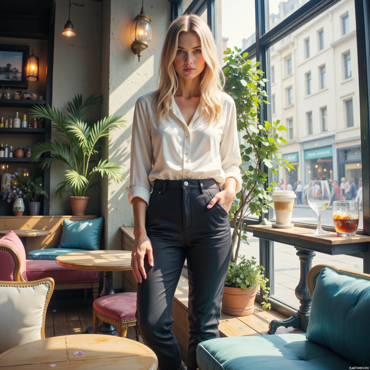 На картинке молодая женщина с светлыми волосами стоит перед окном кафе. На ней стильный комплект: бежевая рубашка и узкие темные джинсы в сочетании с черными ботинками. Окружающая обстановка создает ощущение непринужденности и расслабленности, а деревянная мебель добавляет уюта. Естественный свет проникает сквозь большие окна, освещая интерьер кафе и отбрасывая мягкие тени снаружи.