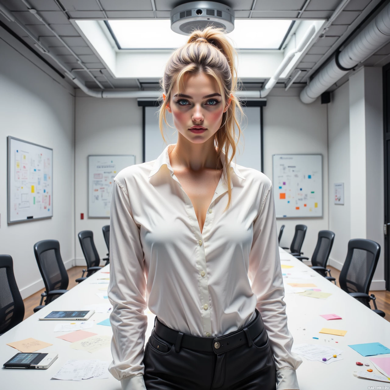На картинке запечатлен человек, стоящий в комнате для совещаний в современном индустриальном стиле. На нём блузка и брюки, волосы собраны в пучок. Взгляд направлен прямо в камеру, выражение лица нейтральное. Освещение создает драматический эффект, подчёркивая очертания помещения и текстуру стен.