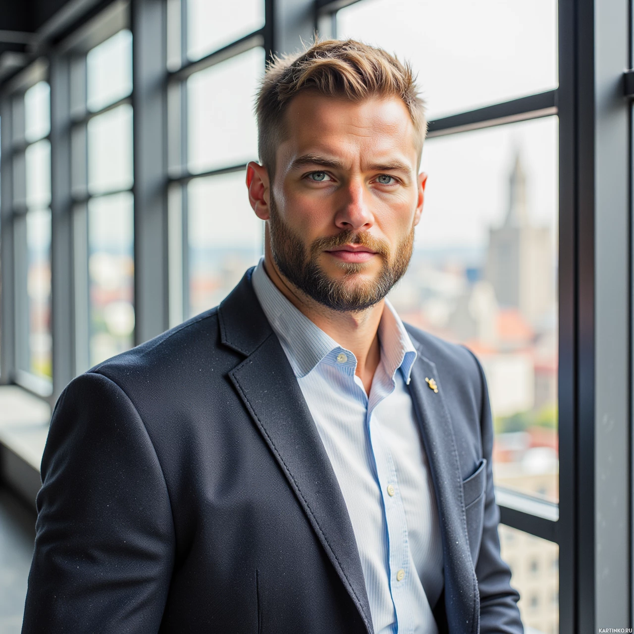Мужчина в костюме, руки в карманах. У него короткие волосы и борода. За спиной – большое окно, сквозь которое виден городской пейзаж.