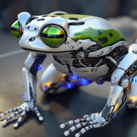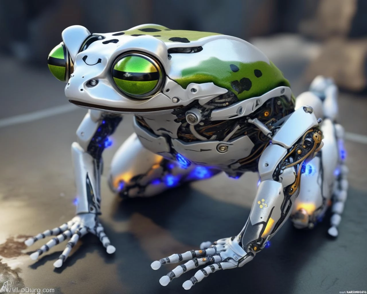 rounded head with what appears to be eyes, a body that looks like a typical frog's, and legs. This robot is depicted in what might be