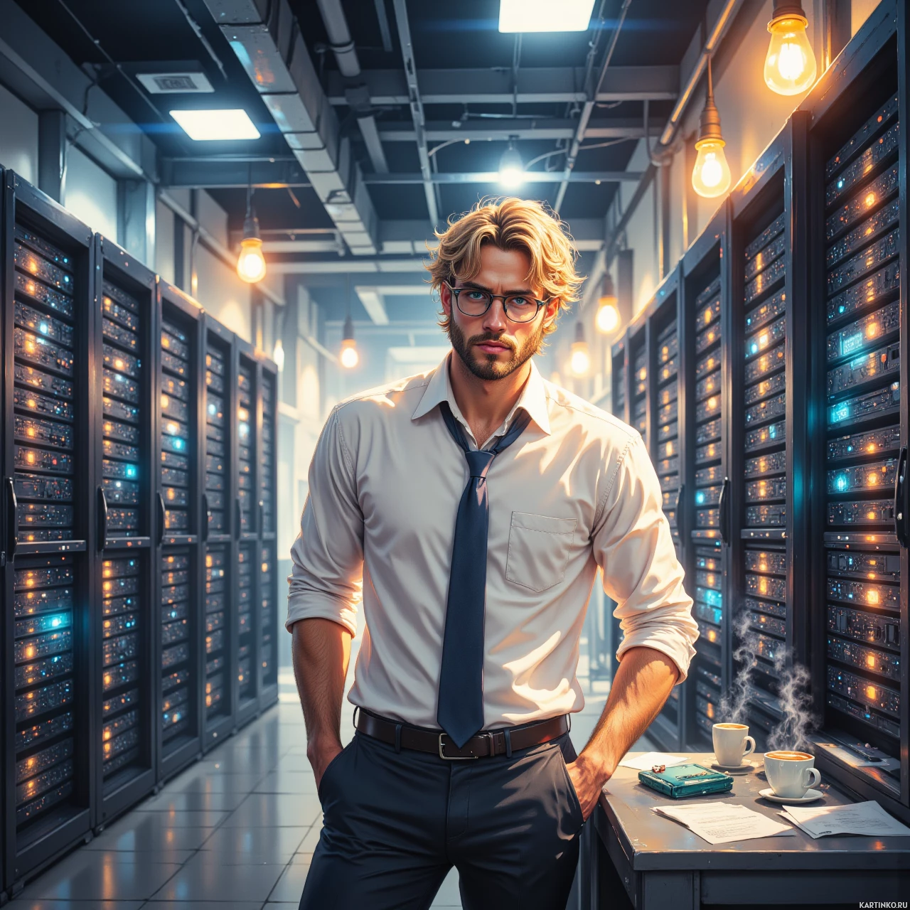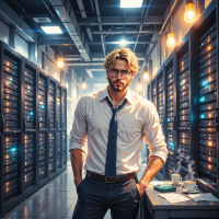 На картинке изображен мужчина, стоящий в помещении, похожем на серверную или дата-центр. На нем очки, легкая щетина, темный костюм и галстук, частично скрытый ракурсом фотографии. По его позе видно, что он, возможно, осматривает или работает с серверами позади него. Вокруг — ряды серверных стоек с синими индикаторами, показывающими их состояние.