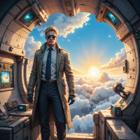 A man wearing sunglasses stands in a futuristic-looking airship cabin with an open hatchway. He's dressed in a long trench coat and is holding his hands on his hips, exuding a confident demeanor. The room contains various pieces of advanced technology, including digital displays and controls. Outside the ship, floating clouds fill the sky as a sunset paints a warm glow across the scene.