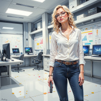На картинке – женщина с светлыми волосами стоит в современном технологическом лаборатории. На ней очки, белая блузка и синие джинсы. Вокруг нее – оборудование: компьютерные мониторы, клавиатуры, мыши. На стенах развешаны схемы и диаграммы, что говорит о рабочей среде, связанной с анализом данных или другой технической области.
