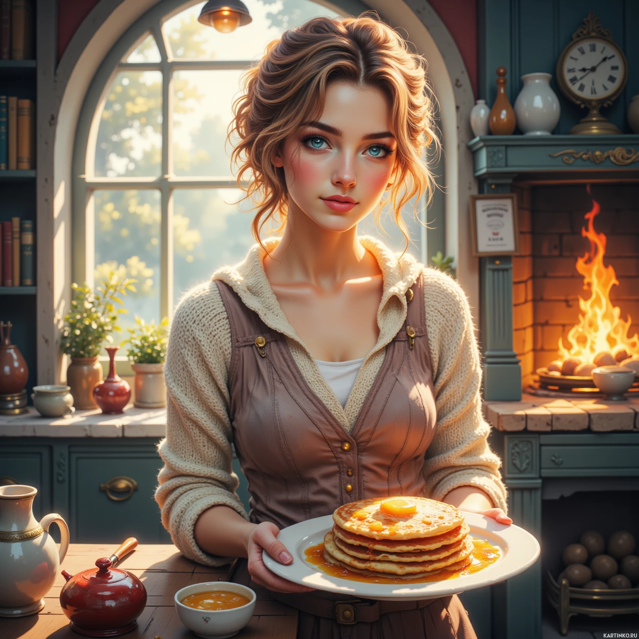 На картинке изображена молодая женщина, стоящая в интерьере, напоминающем уютную деревенскую кухню или булочную. В руках у нее тарелка с двумя блинами. На ней коричненое платье или джемпер с высоким воротником. Комната отделана деревянными панелями, вокруг разбросаны кухонные принадлежности и предметы, среди которых книги и бутылки, создающие атмосферу домашнего уюта. На заднем плане виднеется камин с языками пламени, добавляющим тепла сцене. Освещение мягкое и теплое, подчеркивающее текстуры и цвета обстановки, без резких теней.