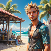 The image depicts a young male with spiky hair, wearing a wetsuit and carrying a surfboard under one arm. He has a backpack on his shoulders. In the background, there is a palm-fringed beach scene with wooden huts and thatched roofs. People can be seen relaxing at tables under the shade of the trees near the water's edge, suggesting a casual beach atmosphere. The sky is clear, indicating good weather conditions for outdoor activities like surfing. The overall style of the image suggests it may be related to adventure or travel themes.