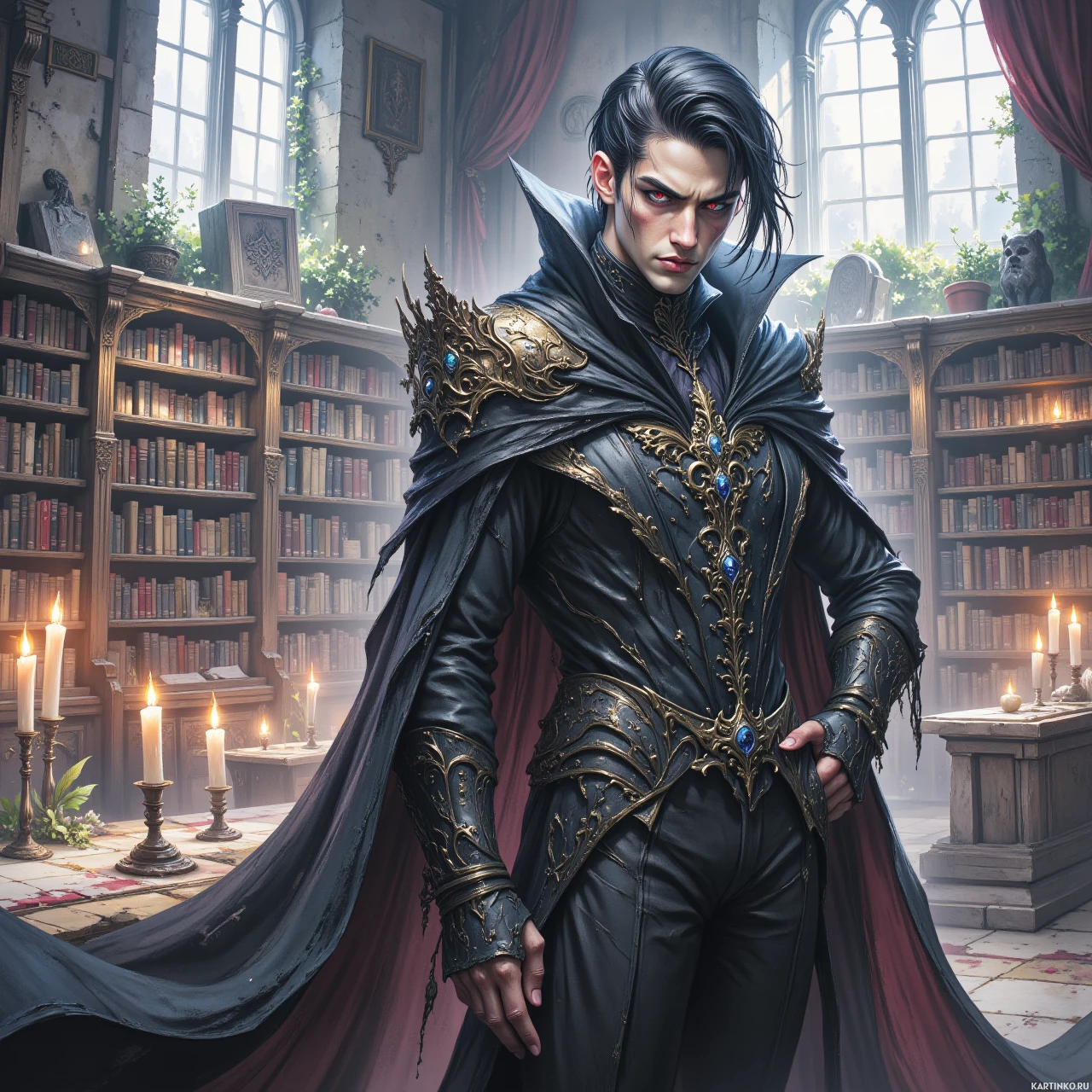 На картинке изображен мужчина в костюме, напоминающем фантазийный или исторический наряд эпохи Викторианской Англии, возможно, с отсылками к мифам о вампирах. У него длинные волосы, зачесанные назад, и лицо выражает напряженность. Он одет в темную одежду, украшенную сложными узорами, включая, кажется, плащ, наброшенный на одно плечо. Мужчина стоит в помещении, похожем на библиотеку или кабинет, с книжными полками, заполненными книгами, освещенном свечами. Вся обстановка пронизана тайной и изысканностью, что подчеркивает его загадочный характер.