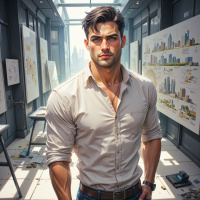 На картинке изображен молодой человек, стоящий в помещении, напоминающем архитектурное бюро или офис. У него короткие темные волосы, и он смотрит в сторону с серьезным выражением лица. На нем светлая рубашка с подвернутыми рукавами и темные брюки. На заднем плане – большие, детализированные архитектурные чертежи, развешанные на стенах или досках, что позволяет предположить, что мужчина связан с архитектурой или дизайном. Освещение яркое и естественное, что говорит о наличии окон за пределами кадра, пропускающих дневной свет.