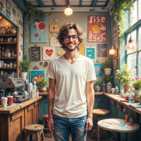 The image depicts a person standing inside a room that appears to be a cafe or bar, indicated by the presence of shelves with various items and pictures hanging on the wall. The individual is wearing glasses, jeans, and a white t-shirt. They have short hair and are smiling at the camera. Behind them, there's a counter with assorted items like cups, bottles, and potted plants adding to the ambiance of the space.