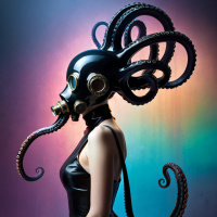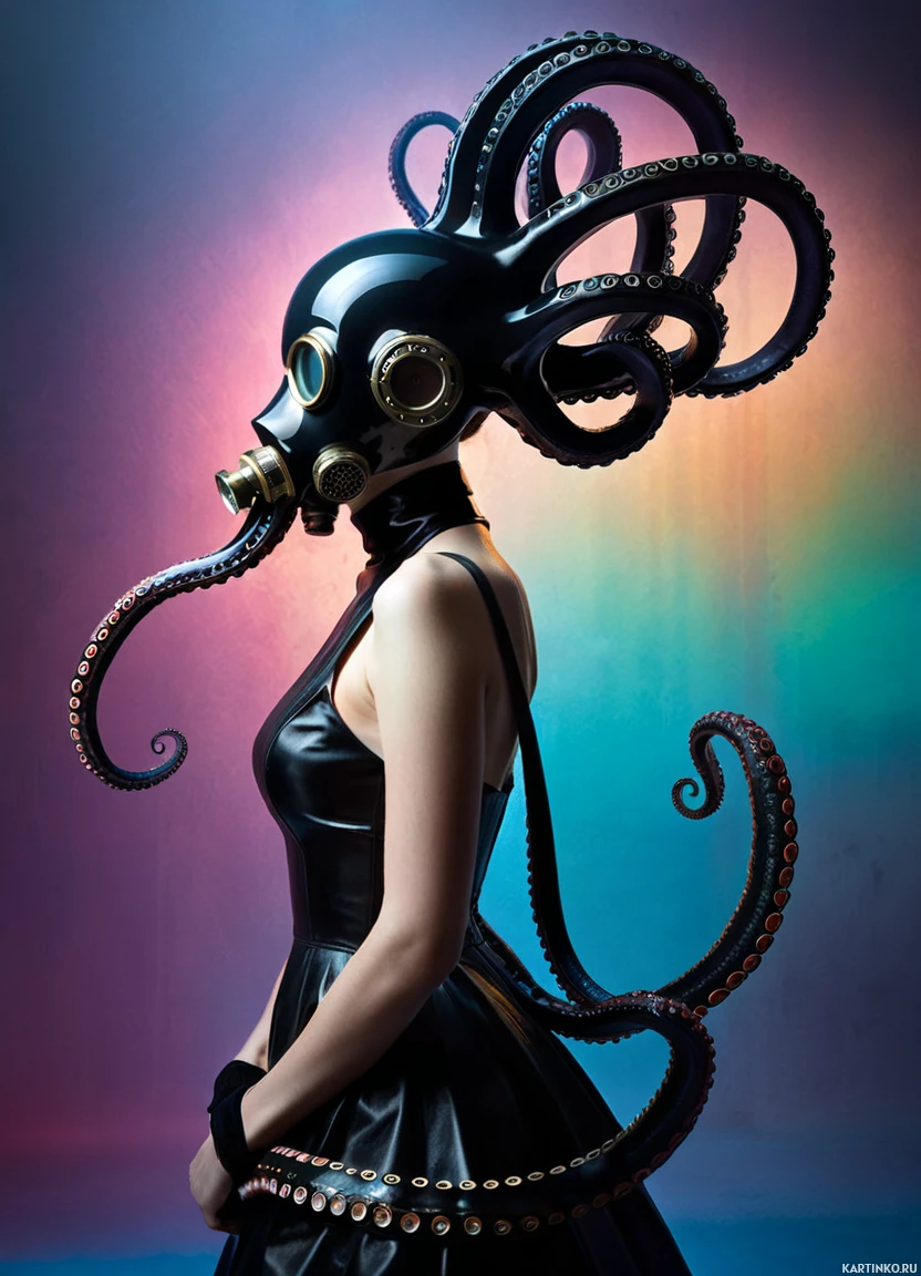 На картинке изображена женщина в сложном костюме, сочетающем в себе элементы научной фантастики и традиционного фэнтези. На её лице – замысловатая маска в виде осьминога, с светящимися глазами и механическими деталями. Маска соединена с респиратором, что отсылает к темам защиты от опасной среды или, возможно, представляет персонажа из научно-фантастического сеттинга. На ней чёрное корсетное платье с высоким воротником, добавляющее образу фантастичности. Её поза и наряд создают впечатление персонажа из произведения спекулятивной фантастики.