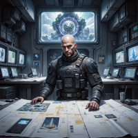 На картинке мужчина сидит за столом в помещении, похоже, высокотехнологичной диспетчерской. На нем тактический жилет, а на лице серьезное выражение. Стол перед ним завален бумагами и оборудованием, что наводит на мысль о важном деле или миссии. На заднем плане – множество экранов с графиками и данными, указывающих на сложную систему. Через большое окно открывается вид на космос с небесными телами, что может говорить о роли этого помещения в астрономических наблюдениях или космических исследованиях. Вся атмосфера картинки создает ощущение срочности и сосредоточенности.