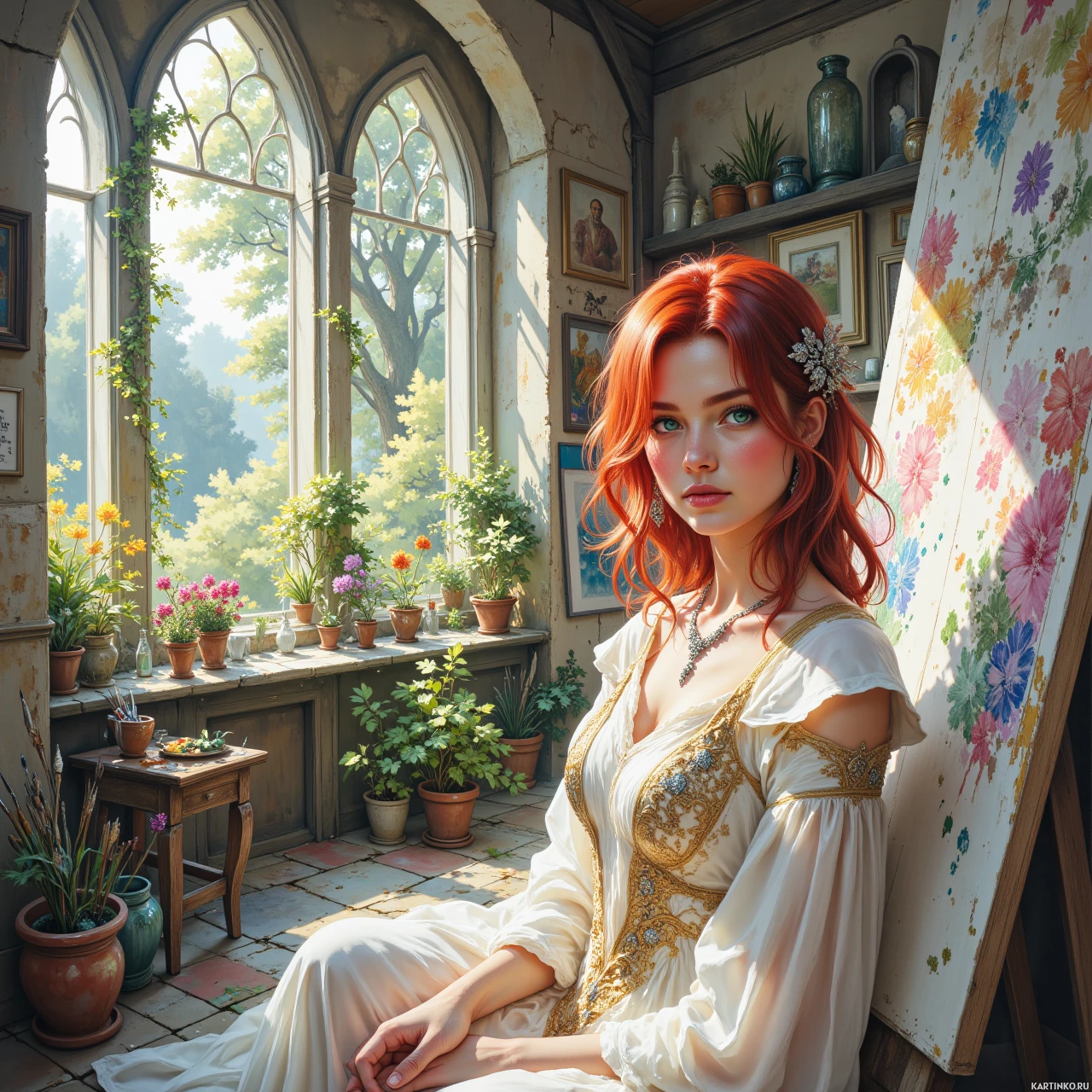 На этой картинке запечатлена молодая женщина с яркими рыжими волосами, застывшая в моменте спокойствия. Она удобно устроилась на деревянном стуле, левая рука покоится на подлокотнике, а правой она нежно поддерживает лицо. На ней элегантное золотое платье, ниспадающее до пола, и корона, украшающая голову. Судя по всему, это уютная мастерская художника. Окно за её спиной намекает на солнечный день, ведь солнечный свет проникает внутрь, согревая её лицо и помещение. Слева от неё стоит мольберт, свидетельствующий о её творческих занятиях. Вокруг разбросаны различные художественные принадлежности, кисти и палитры, создавая атмосферу творческого пространства. Милые горшки с растениями на подоконнике добавляют очарования этой сцене, их листья тянутся к свету. В целом, атмосфера наполнена спокойствием и творческим вдохновением, а рыжеволосая женщина является главным центром внимания.