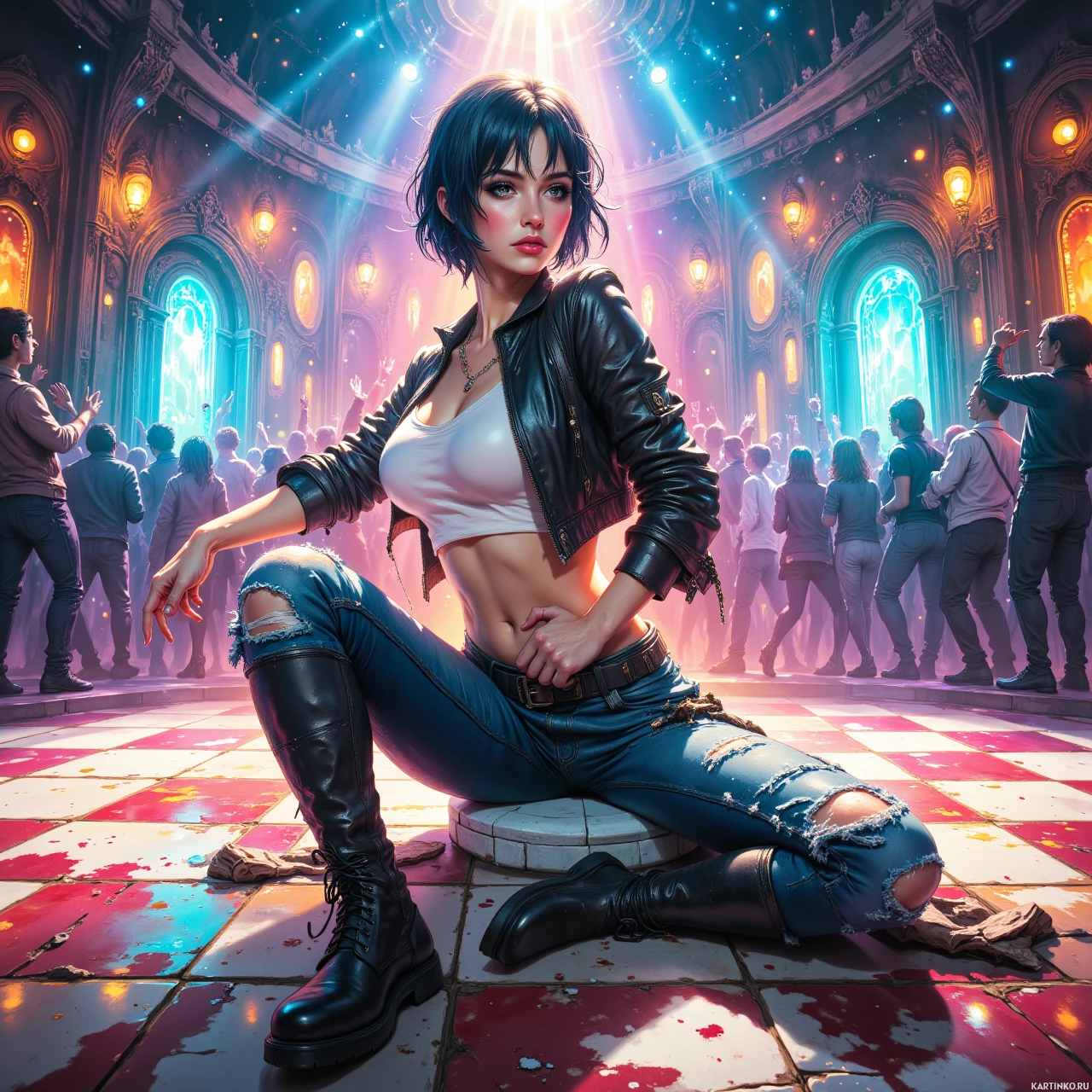На картинке изображена девушка с каштановыми волосами до плеч. Она запечатлена в энергичной позе, сидя на полу с шахматной расцветкой, одна рука лежит на бедре, а в другой она держит предмет, похожий на зажигалку. На ней черная кожаная куртка поверх белой майки, темные джинсы с потертостями и черные ботинки с разорванными деталями. У нее серьезное выражение лица и она смотрит прямо на зрителя. На заднем плане группа людей занята тем, что похоже на танец или выступление, в архитектурном пространстве, которое может быть частью ночного клуба или подпольного заведения. Освещение в сцене драматичное, теплый свет исходит сверху и отбрасывает тени на шахматный пол.